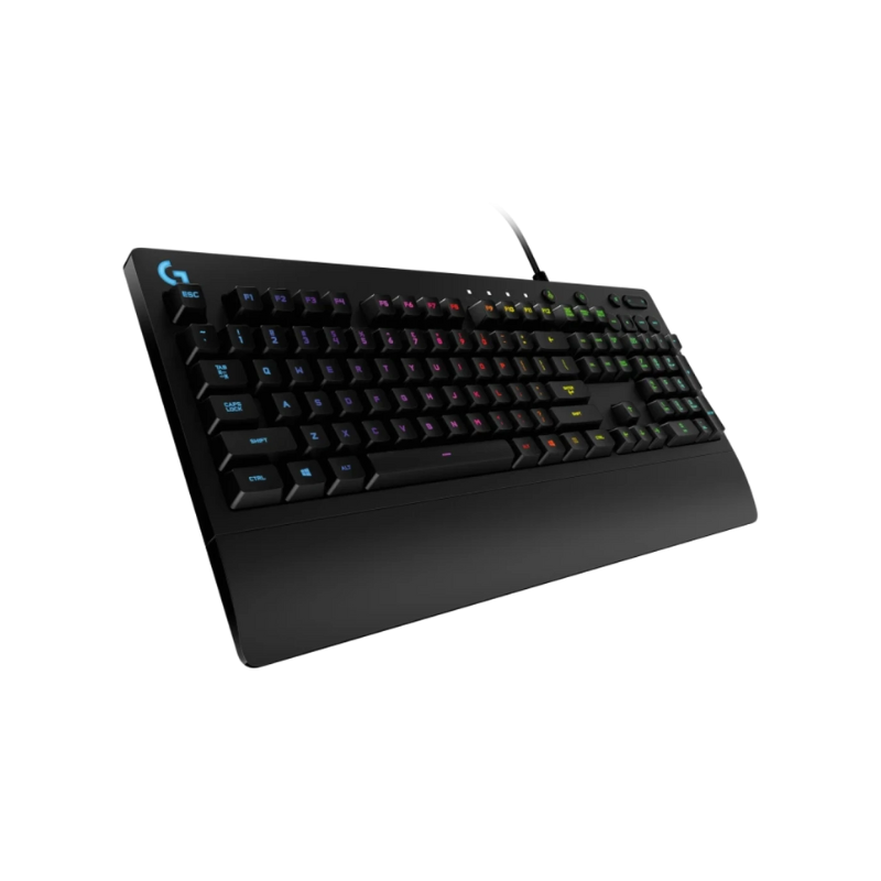 Teclado gamer con teclas tipo mecánicas Mech-Dome, retroiluminación RGB LIGHTSYNC personalizable en 5 zonas, y diseño resistente a salpicaduras. Incluye reposamuñecas y controles multimedia dedicados para una experiencia cómoda y completa.